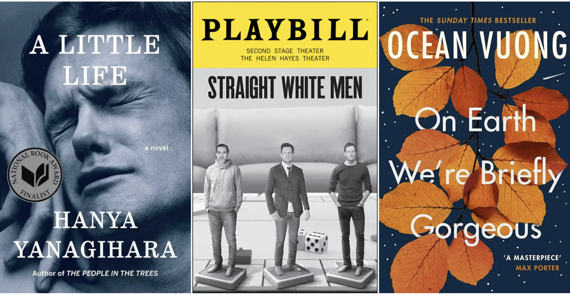 Image credit [from left to right]: Peter Hujar, Orgasmic Man. Designed by Cardon Webb, A Little Life, Vintage, 2016. Front Cover; Straight White Men, Helen Hayes Theater, New York, Playbill, 2018; Designed by Suzanne Dean, On Earth We’re Briefly Gorgeous, Vintage, 2020. Front cover.
